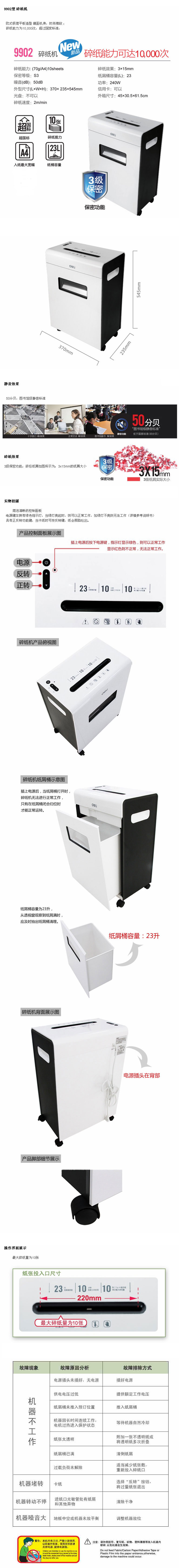 产品规格:37x23.5x54.5cm 外箱尺寸:45x30.5x61.5cm 包装数量:1/1 保密等级:3级 机器噪音:<58DB 机器功率:240w 碎纸能力:10张 连续碎纸:10min 碎纸尺寸:3x15mm 纸筒容量:23L 进纸宽幅:A4 毛重:13.4 kg