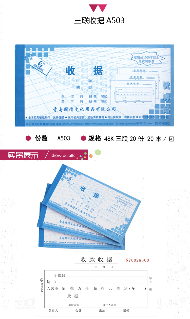 品牌:国增A502 规格:48K 17*9cm 三联20组 所属分类:收款收据 包装数量:20本/包