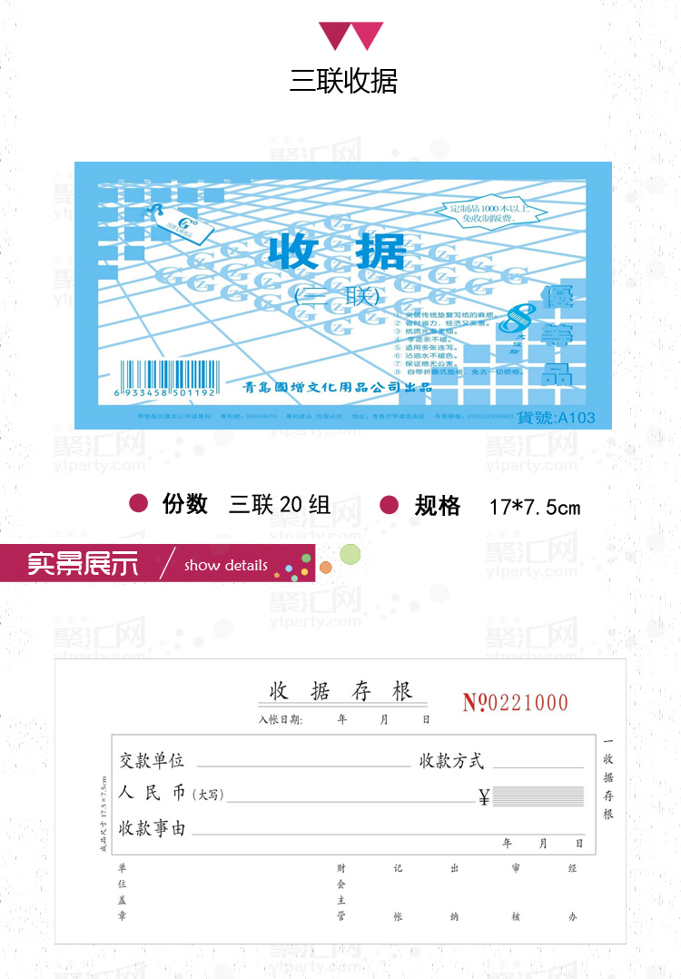 品牌:国增A103 规格:60K 17*7.5cm 三联20组 所属分类:收据 包装数量:20本/包