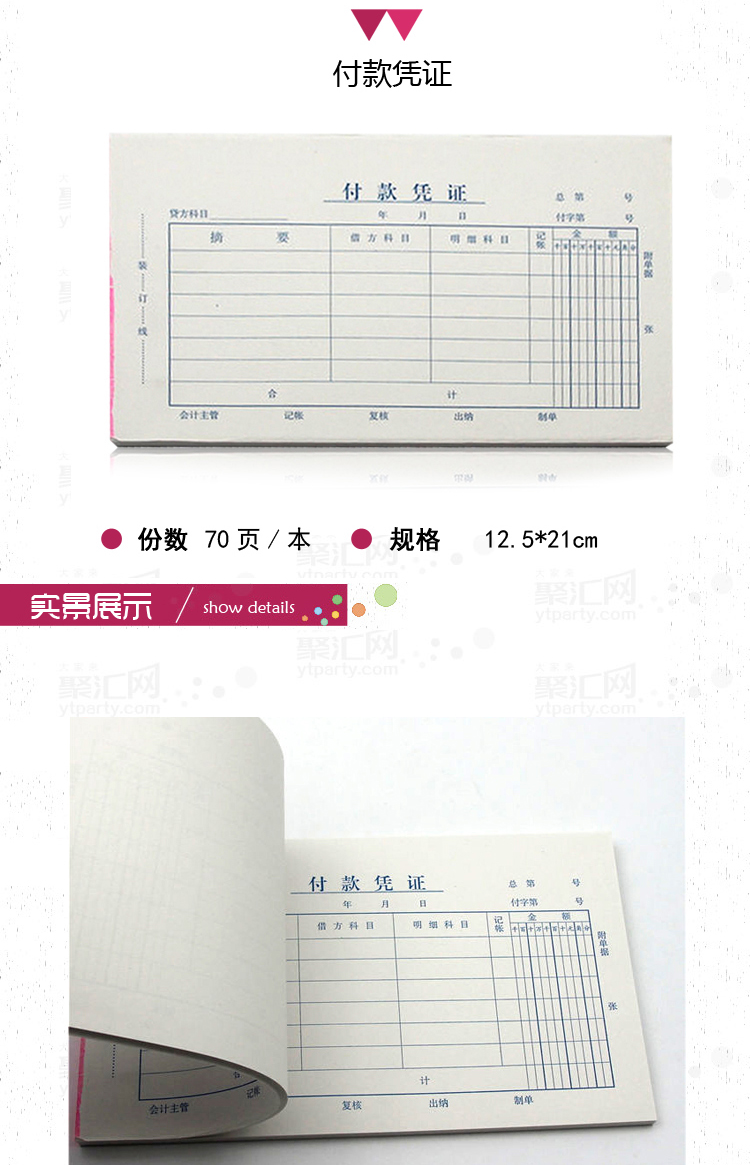 名称:付款凭证 规格:12.5*21cm 70张/本 所属分类:单据