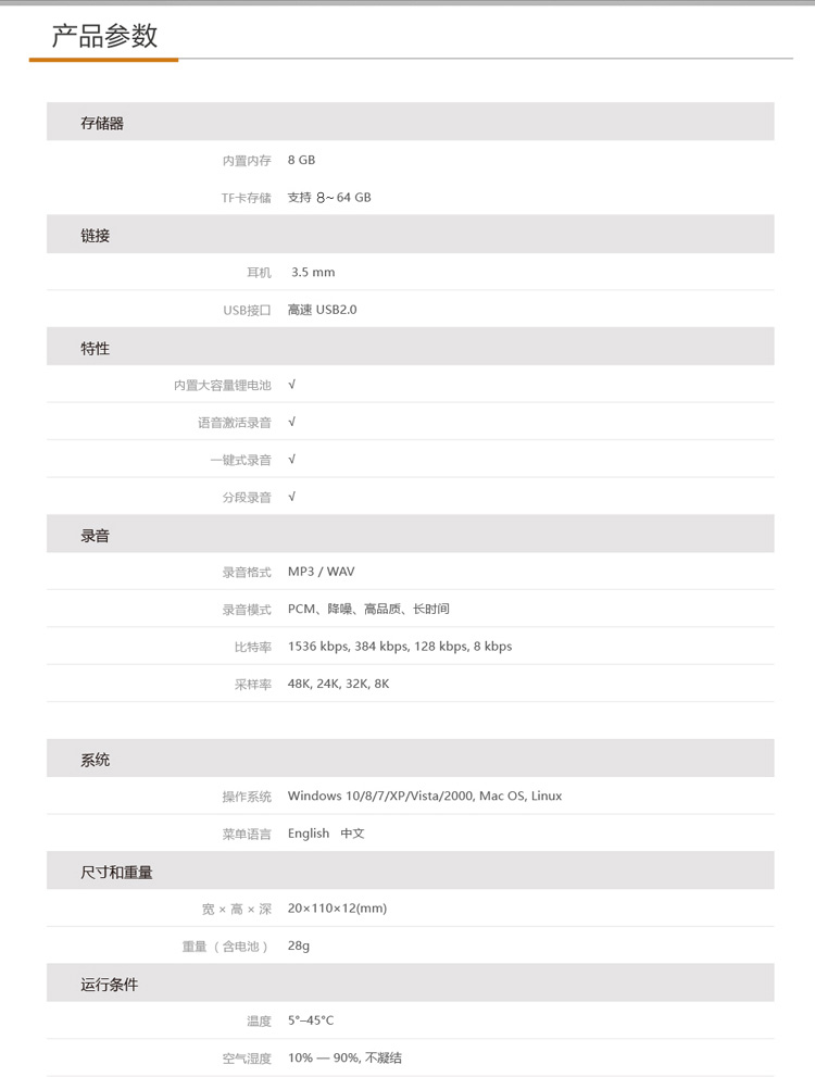 用途:会议存储卡类型:TF卡容量:8G形状:棒棒型电池规格:锂电池功能:录音屏幕:非触摸屏外观材质:塑料