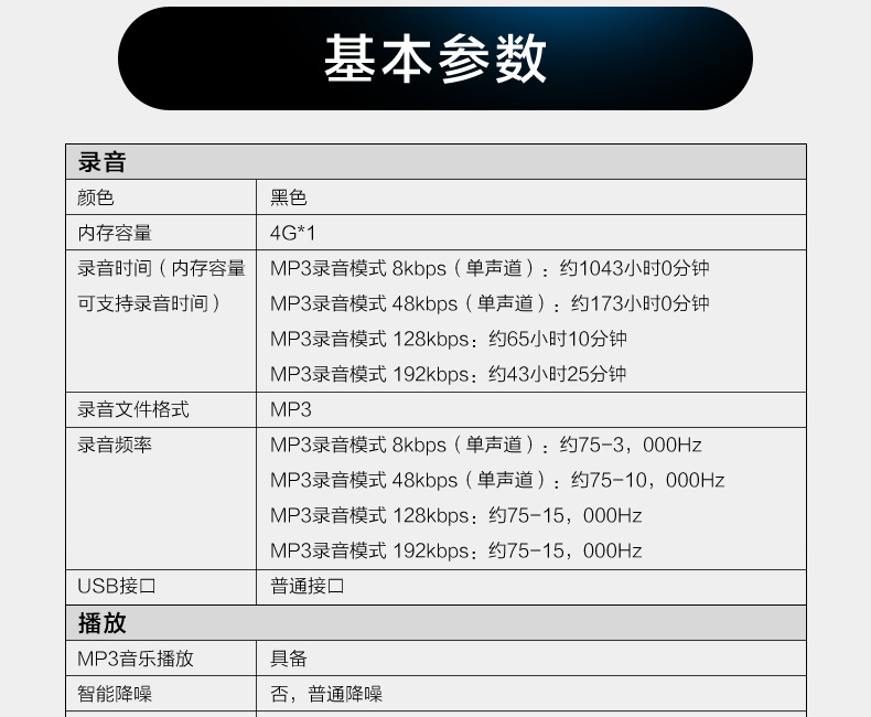 商品毛重:72.00g商品产地:中国大陆货号:ICD-PX240存储卡类型:不支持扩展卡容量:4G用途:学习电池规格:AAA碱性电池功能:录音屏幕:非触摸屏外观材质:塑料